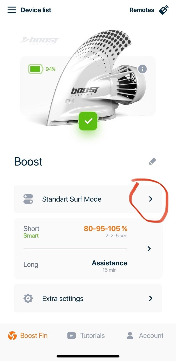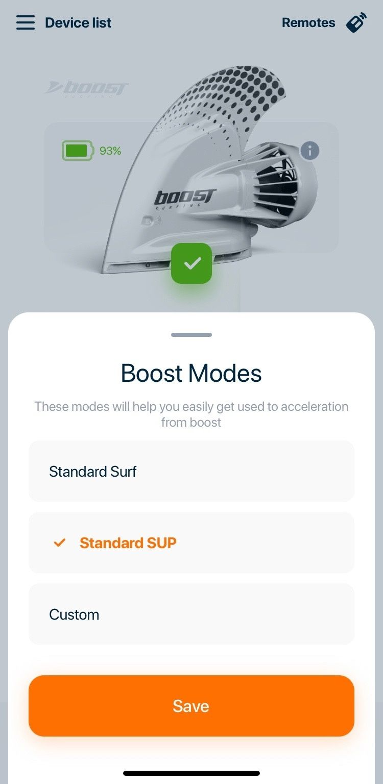 Note: The Surf Mode is set by default, so if you’re using the fin with a SUP, we strongly recommend changing the mode in the app. Connect your Fin to the BoostFin App to change the mode and settings.
